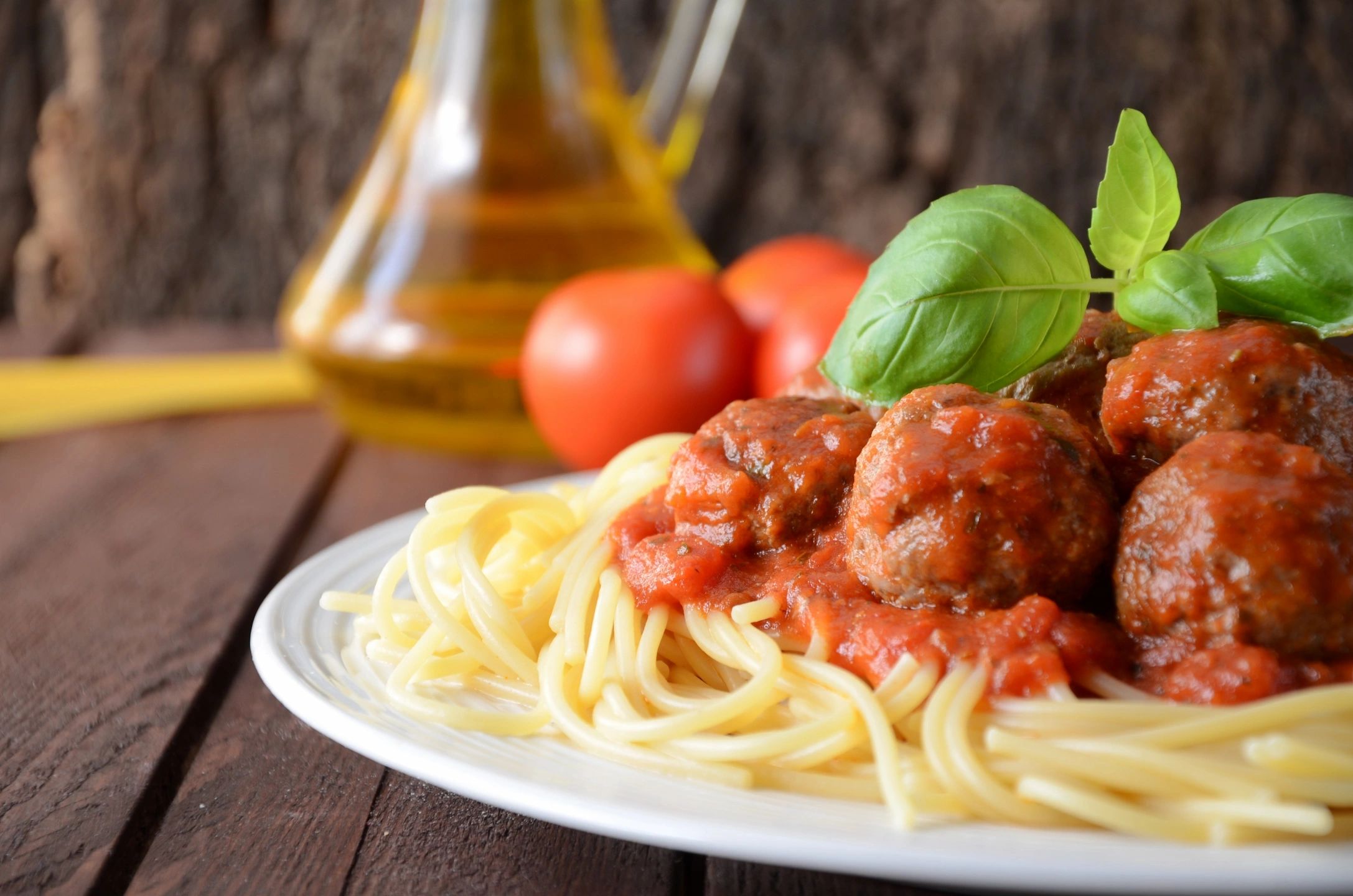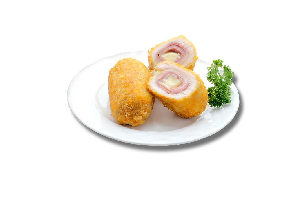 Fried chicken breasts stuffed with bacon & mozzarella, served with pasta red sauce
