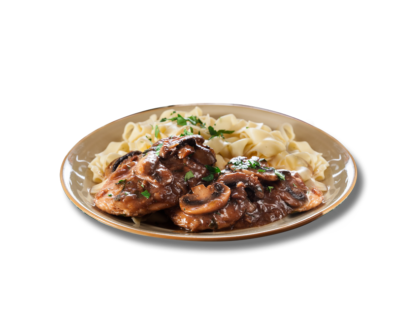 Beef with mushroom sauce, served with white rice & sautéed vegetables