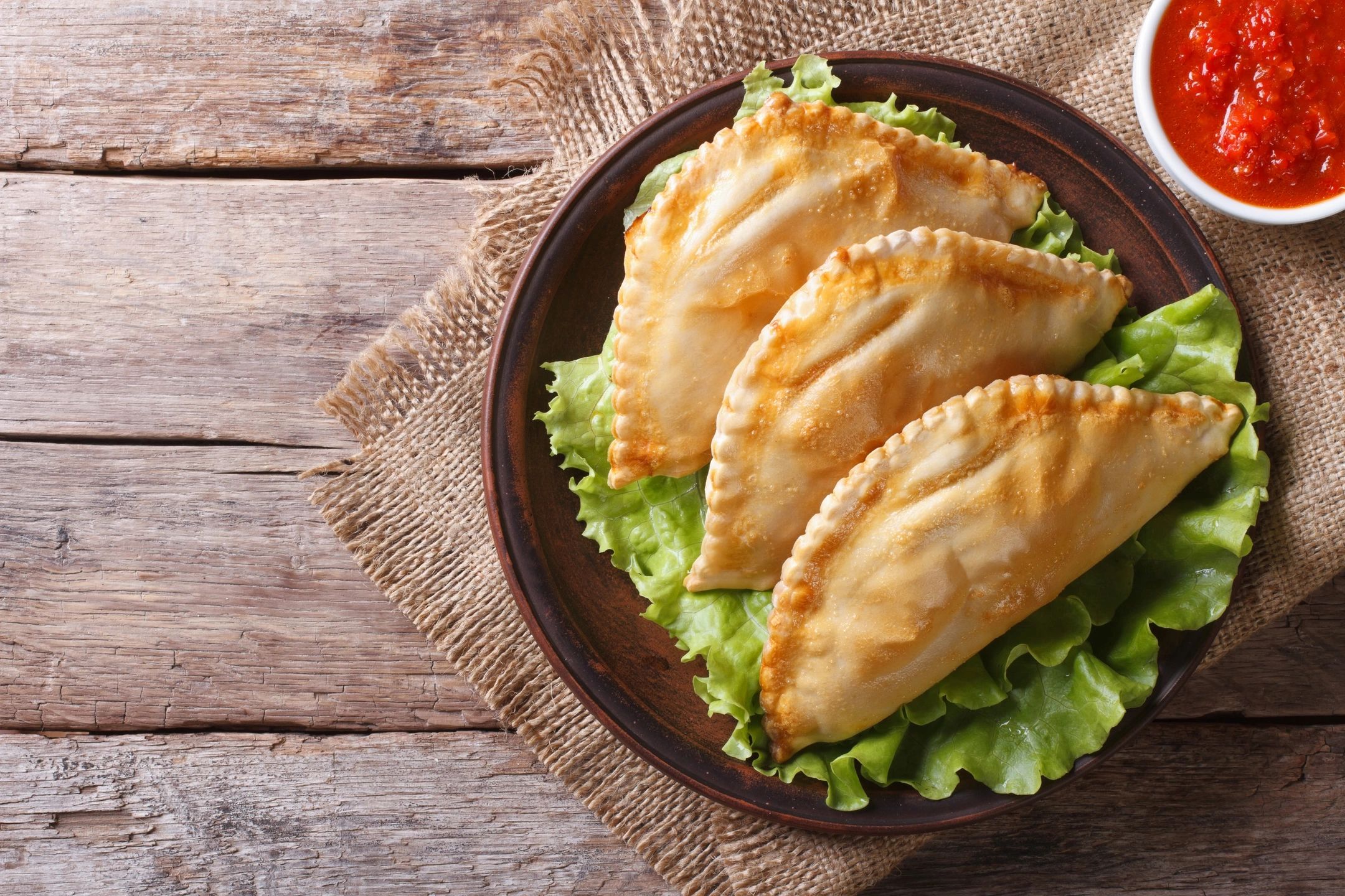 Stuffed sambousek with cheese or minced meat, served with your choice of sauce
